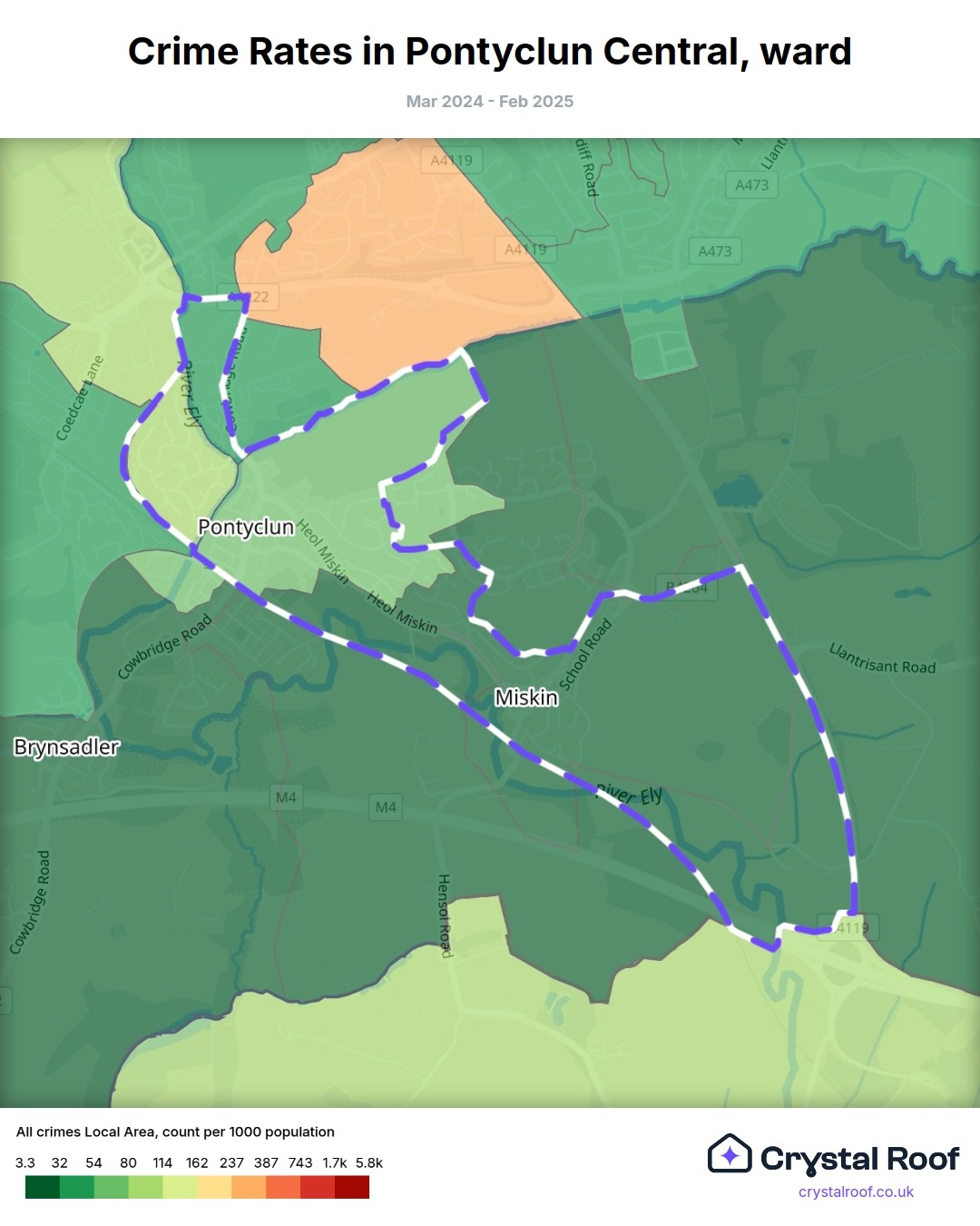 Pontyclun Central, (ward) includes areas with the following crime ratings (see map):