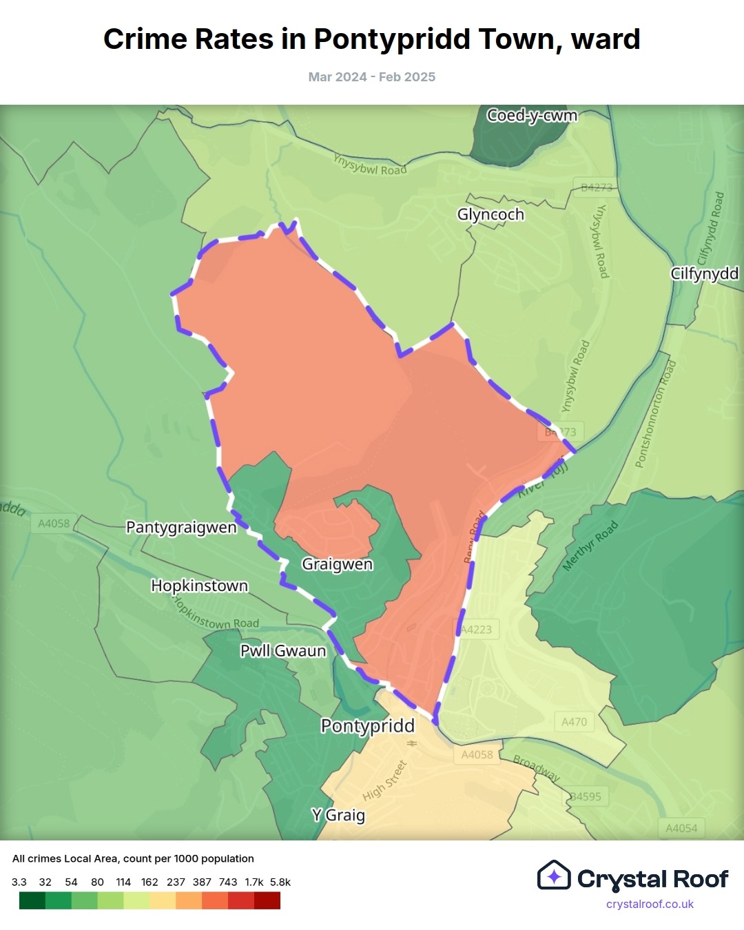 Pontypridd Town, (ward) includes areas with the following crime ratings (see map):