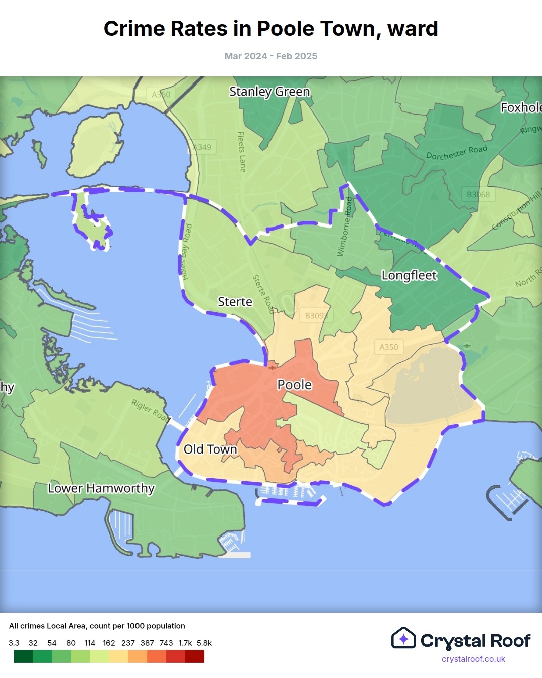 Poole Town, (ward) includes areas with the following crime ratings (see map):