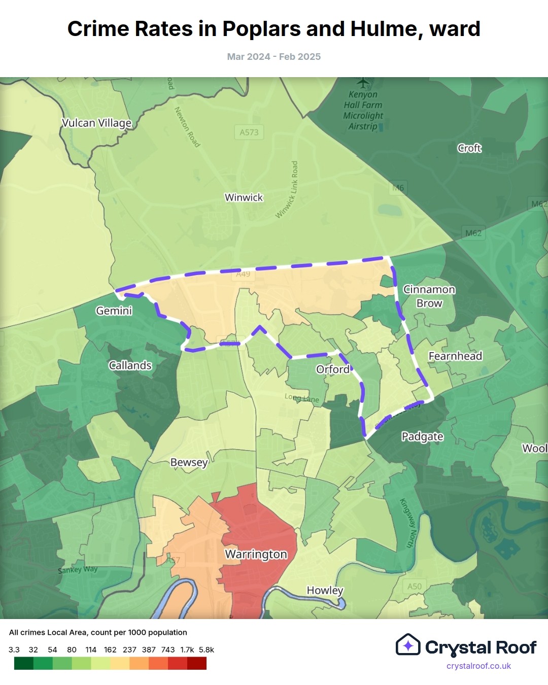 Poplars and Hulme (ward) is located within Warrington (borough). Annual total crime rate in Warrington (borough) is 71.2 crimes per thousand resident population, which can be rated as 2 out of 10 or low crime level compared to other local authority districts in England and Wales.