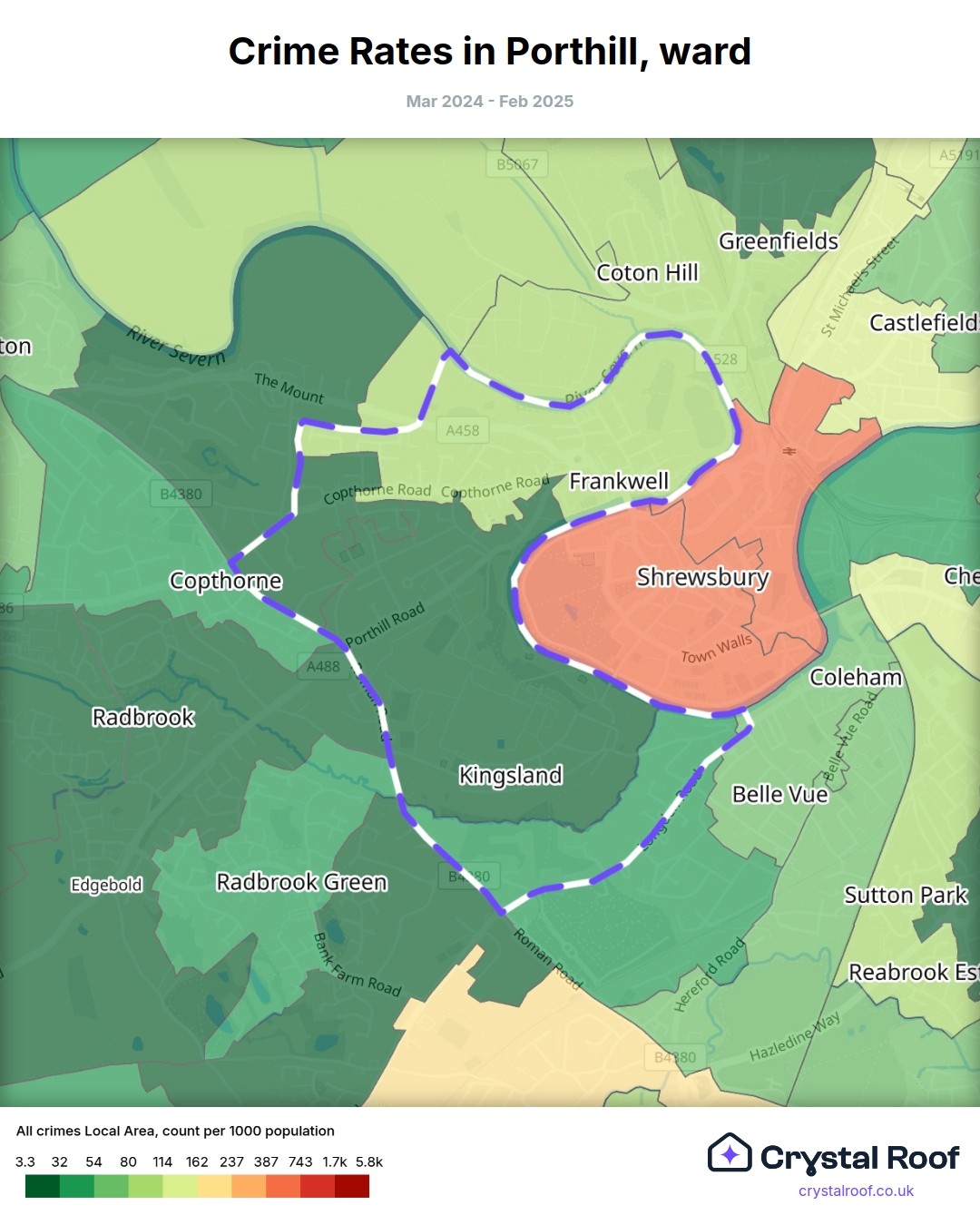 Porthill, (ward) includes areas with the following crime ratings (see map):