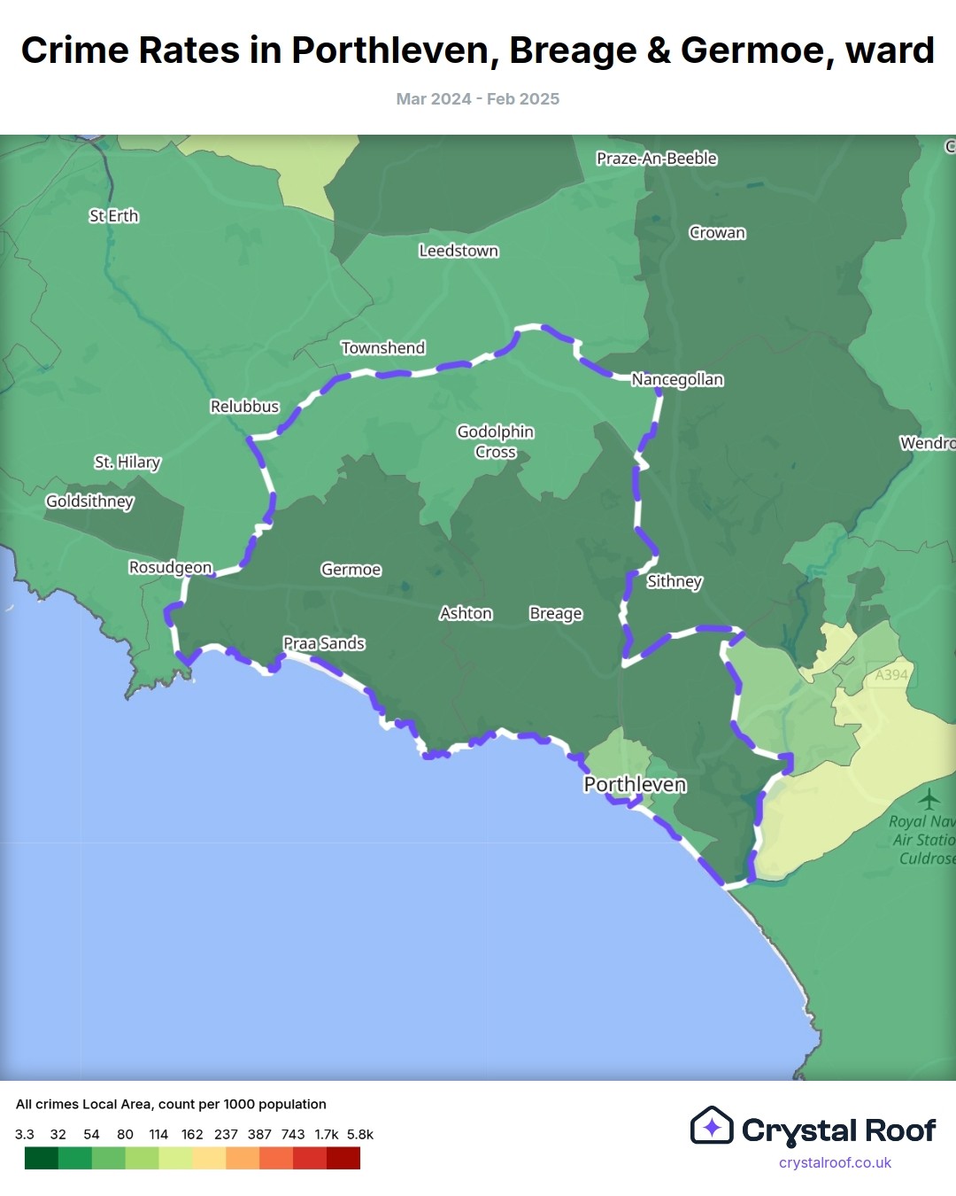 Porthleven, Breage & Germoe, (ward) includes areas with the following crime ratings (see map):