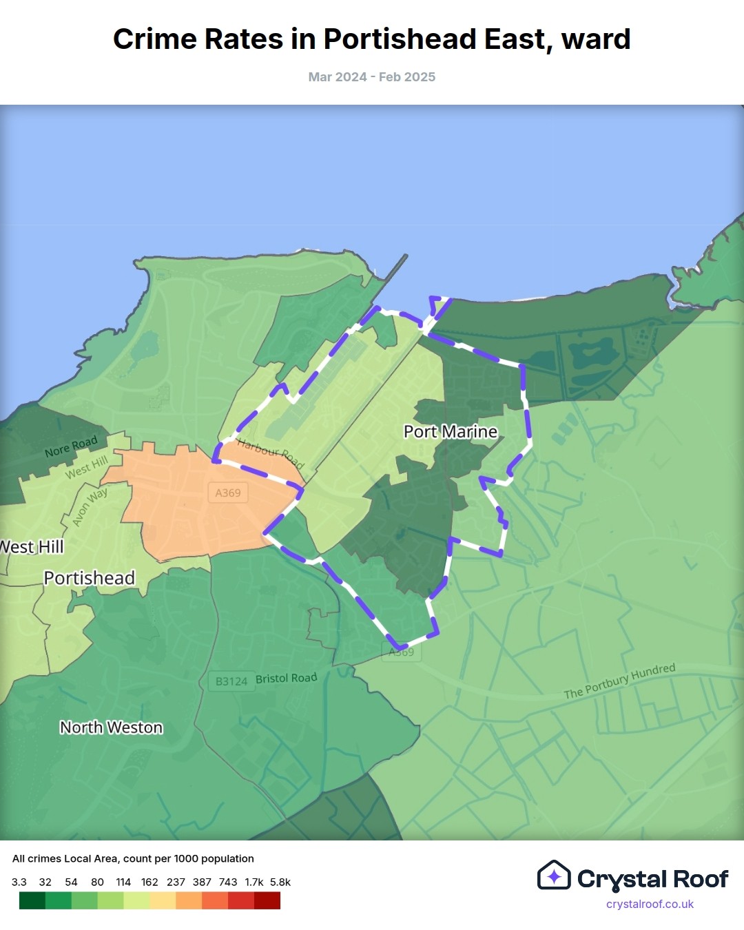 Portishead East, (ward) includes areas with the following crime ratings (see map):