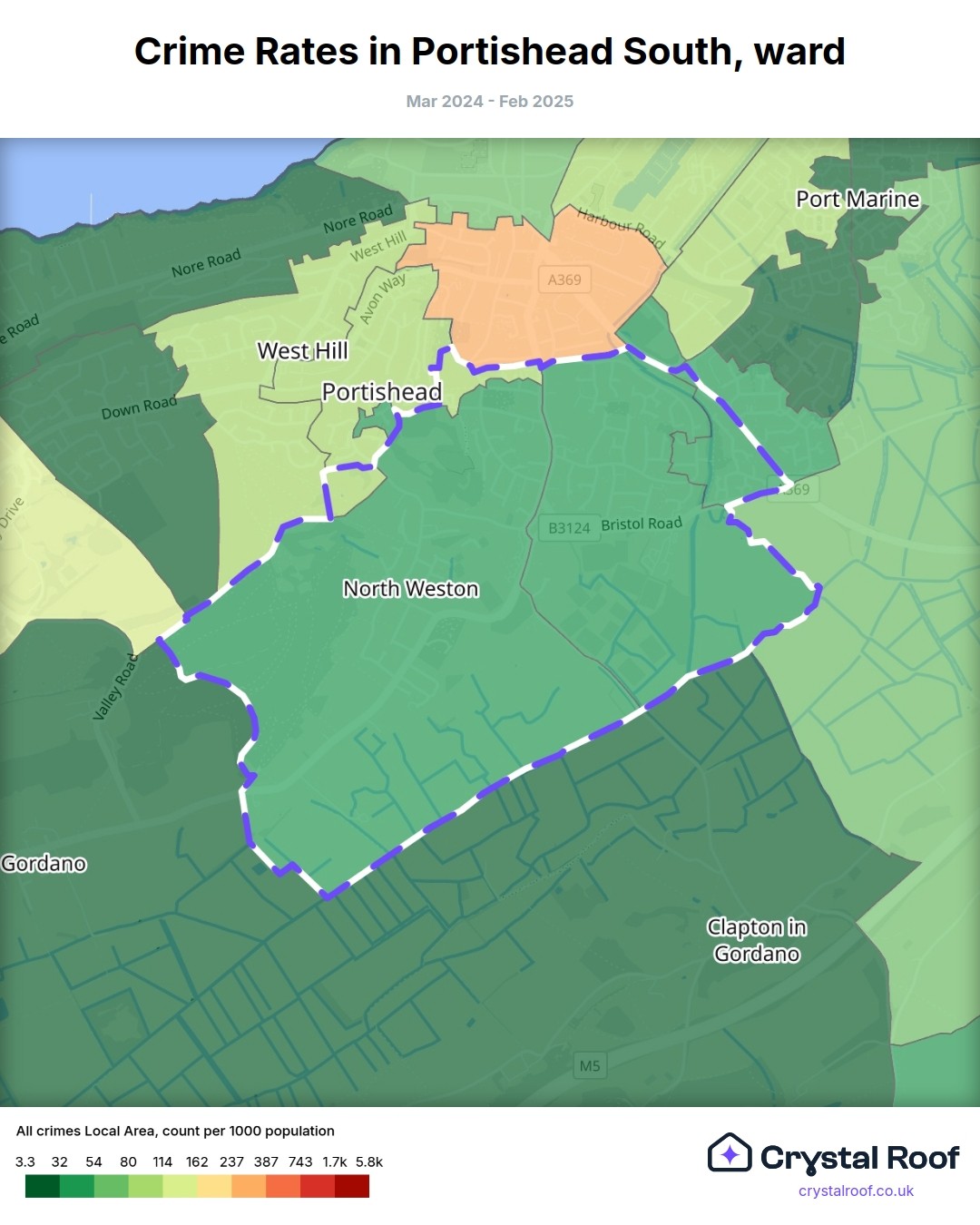 Portishead South, (ward) includes areas with the following crime ratings (see map):