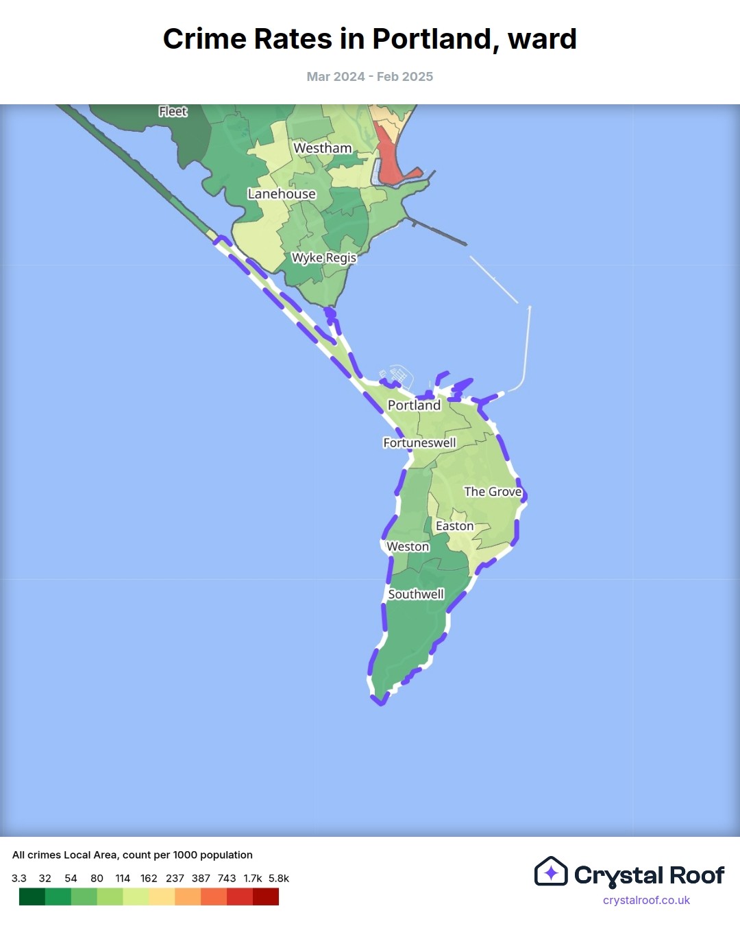 Portland (ward) is located within Dorset (borough). Annual total crime rate in Dorset (borough) is 57.2 crimes per thousand resident population, which can be rated as 1 out of 10 or low crime level compared to other local authority districts in England and Wales.