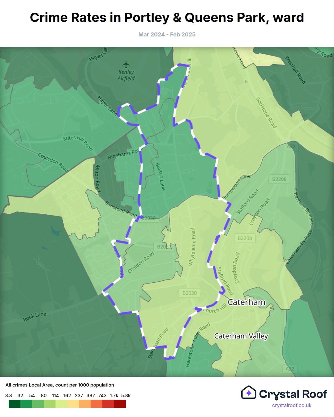 Portley & Queens Park (ward) is located within Tandridge (borough). Annual total crime rate in Tandridge (borough) is 70.9 crimes per thousand resident population, which can be rated as 2 out of 10 or low crime level compared to other local authority districts in England and Wales.