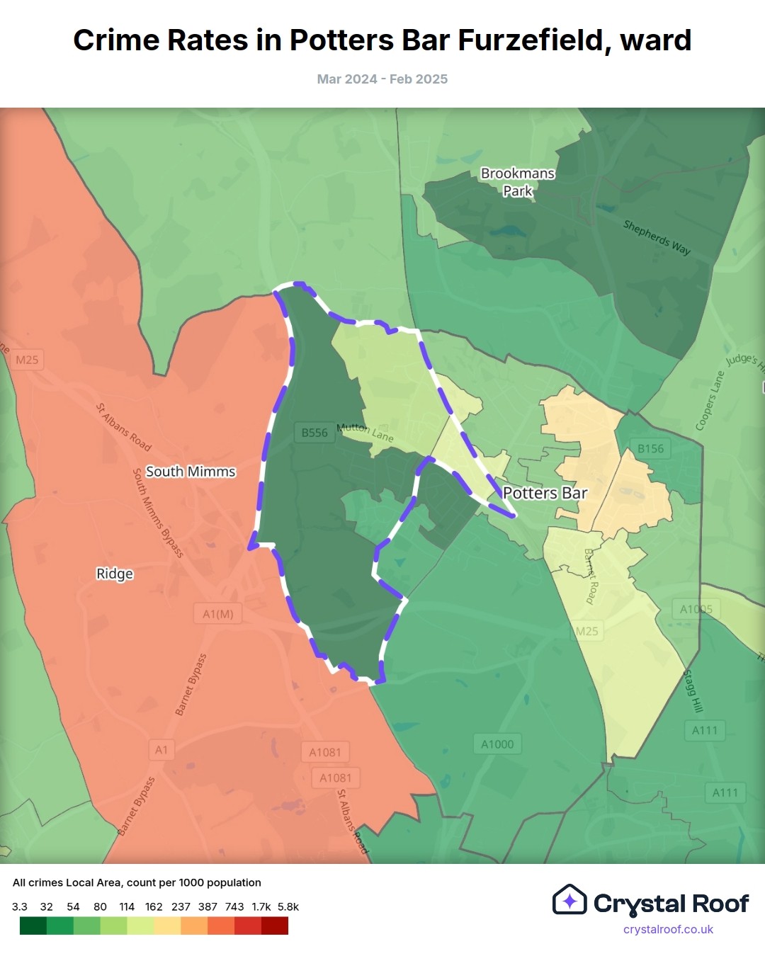 Potters Bar Furzefield, (ward) includes areas with the following crime ratings (see map):