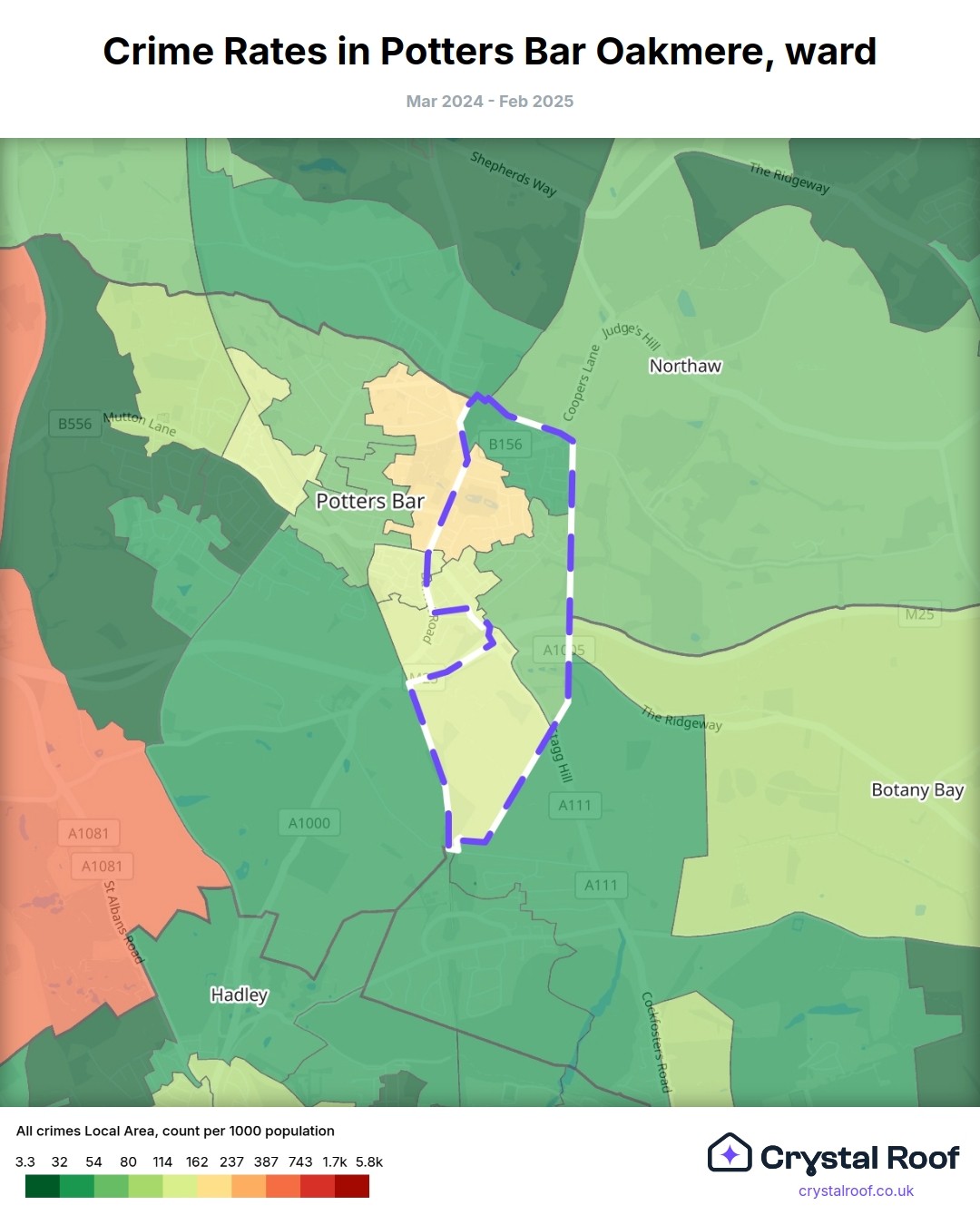 Potters Bar Oakmere, (ward) includes areas with the following crime ratings (see map):