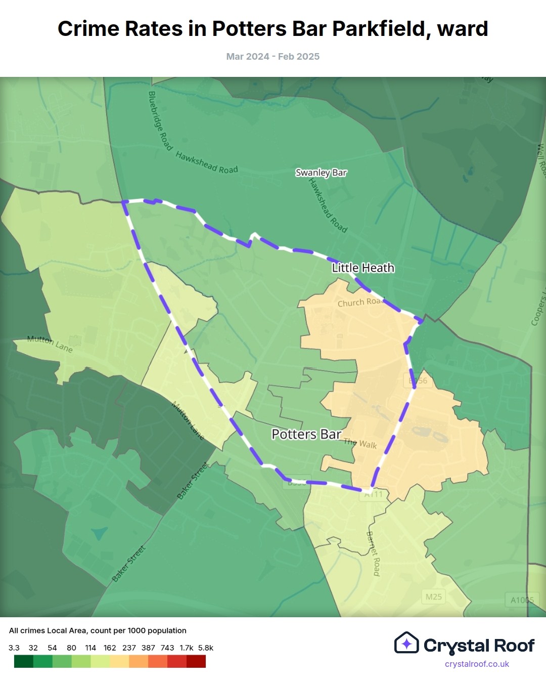 Potters Bar Parkfield, (ward) includes areas with the following crime ratings (see map):