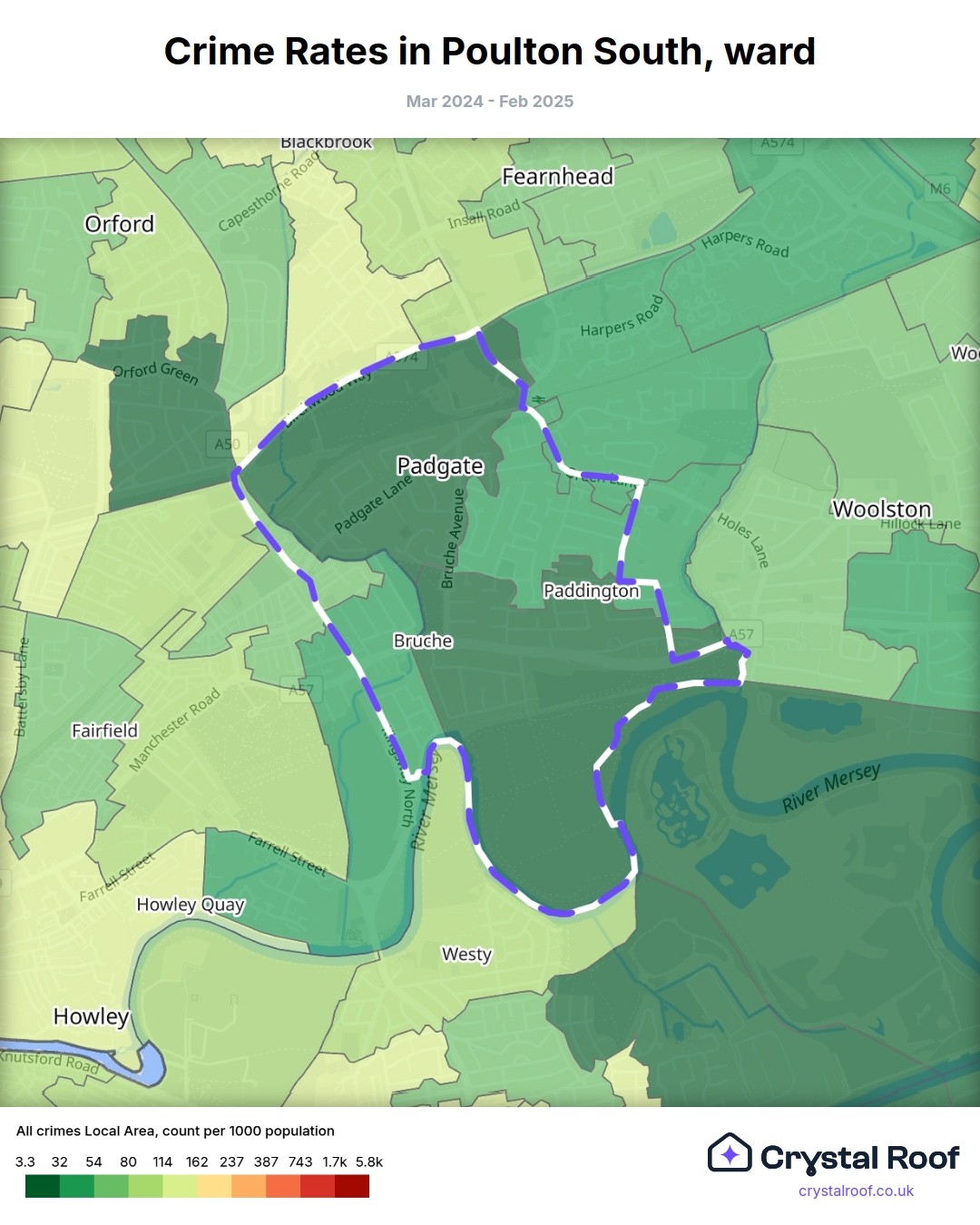 Poulton South (ward) is located within Warrington (borough). Annual total crime rate in Warrington (borough) is 71.2 crimes per thousand resident population, which can be rated as 2 out of 10 or low crime level compared to other local authority districts in England and Wales.