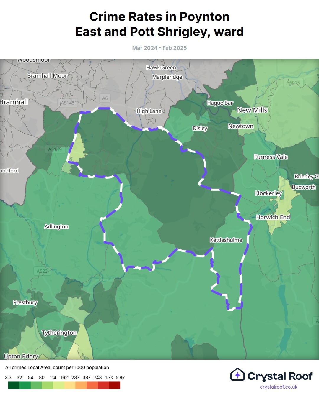 Poynton East and Pott Shrigley, (ward) includes areas with the following crime ratings (see map):