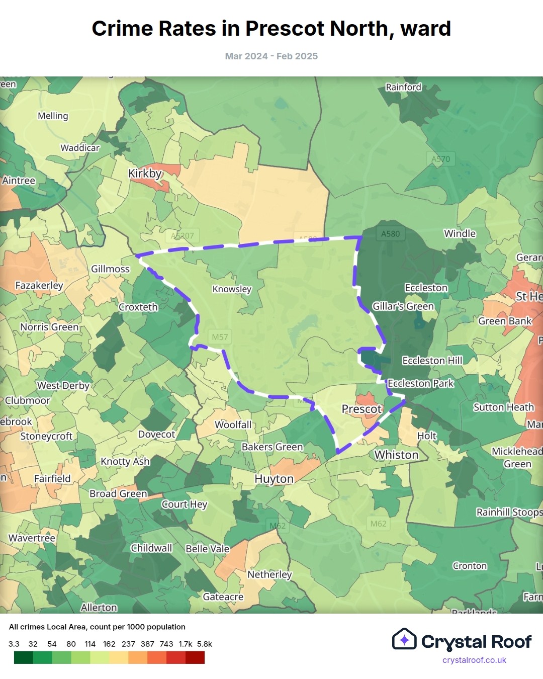 The figures in grey indicate the relative ratings of Prescot North (ward) for a specific crime type compared to other wards in England and Wales.
