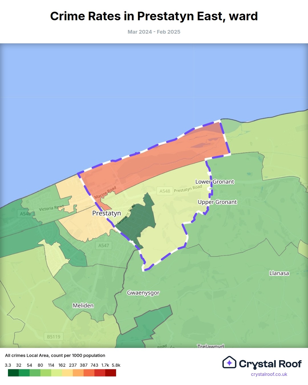 Prestatyn East, (ward) includes areas with the following crime ratings (see map):