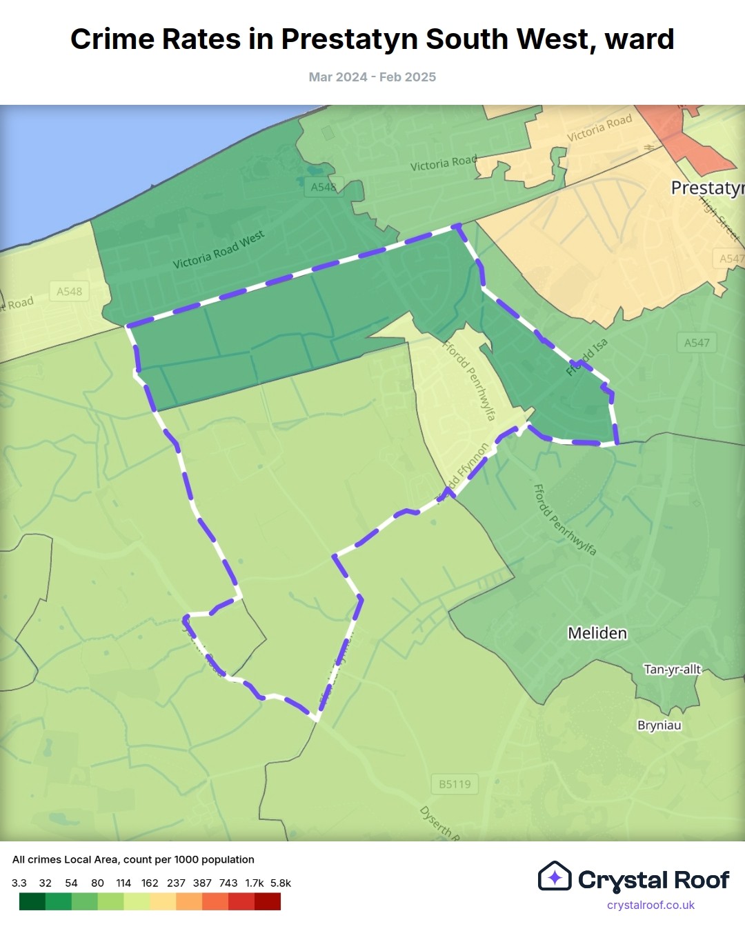 Prestatyn South West, (ward) includes areas with the following crime ratings (see map):