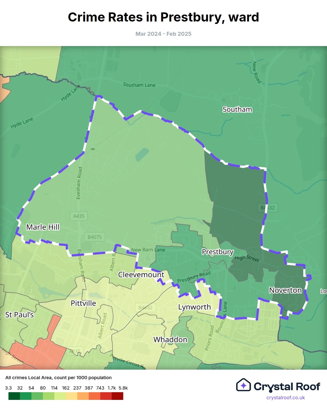 Prestbury (ward) is located within Cheltenham (borough). Annual total crime rate in Cheltenham (borough) is 107 crimes per thousand resident population, which can be rated as 5 out of 10 or medium crime level compared to other local authority districts in England and Wales.