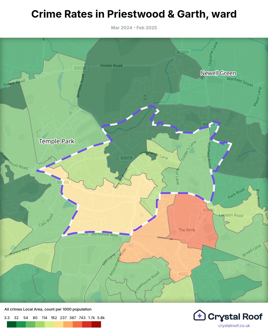 Priestwood & Garth, (ward) includes areas with the following crime ratings (see map):