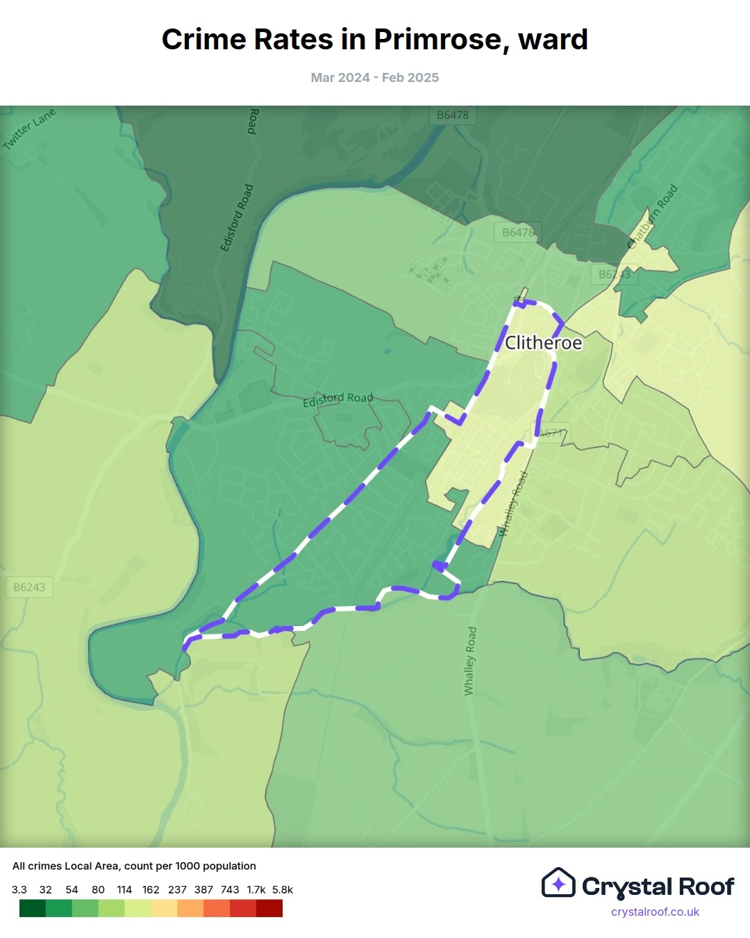 Primrose, (ward) includes areas with the following crime ratings (see map):