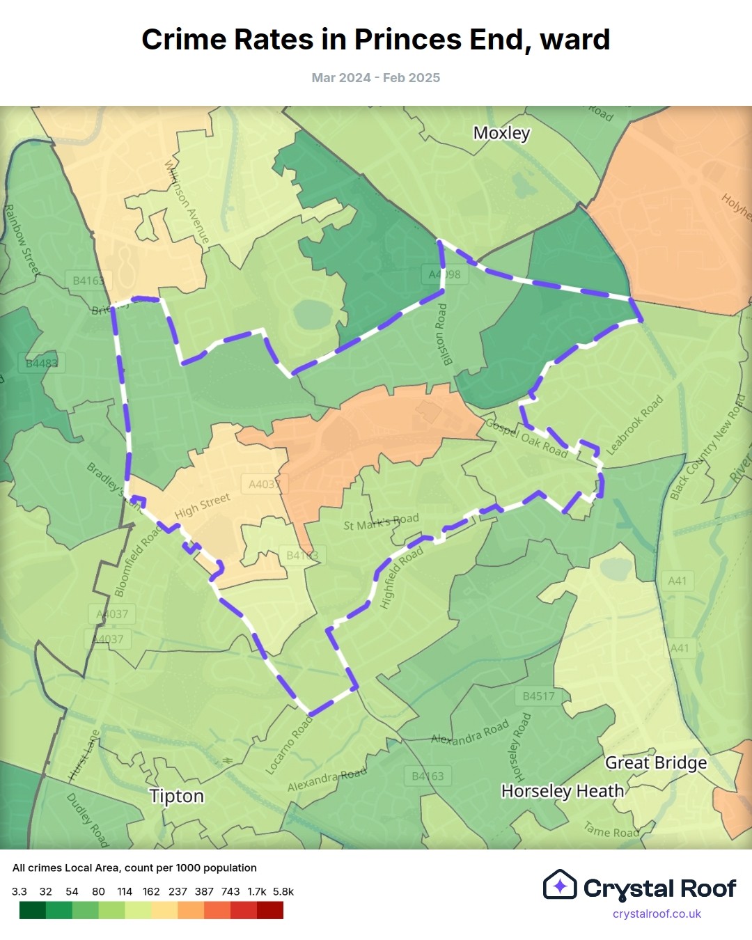 Princes End, (ward) includes areas with the following crime ratings (see map):