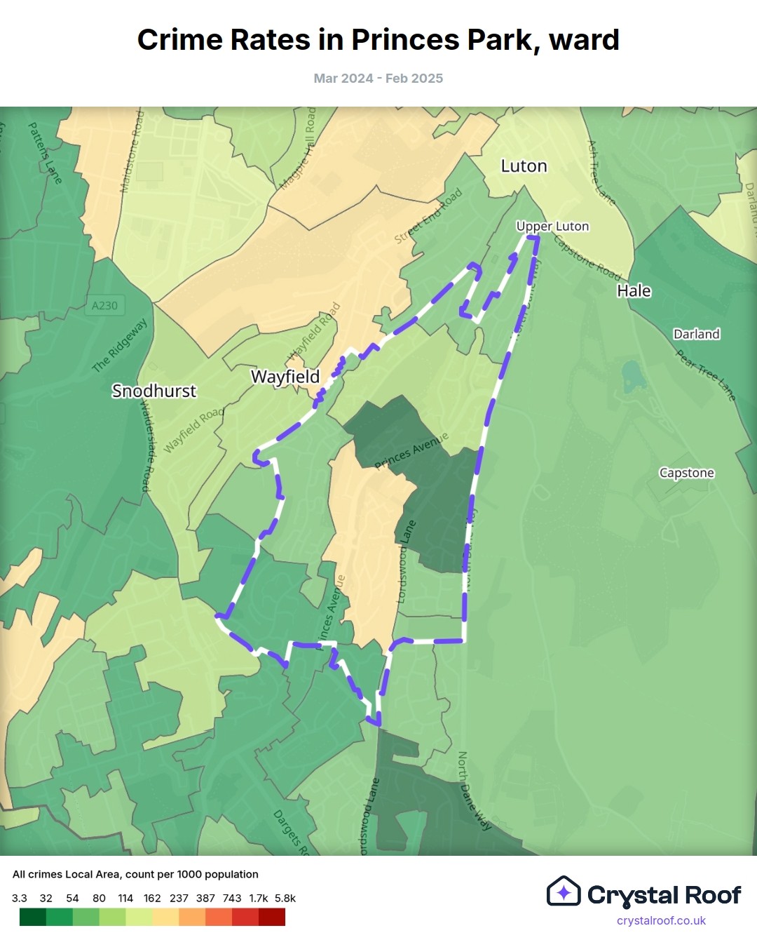Princes Park (ward) is located within Medway (borough). Annual total crime rate in Medway (borough) is 110 crimes per thousand resident population, which can be rated as 5 out of 10 or medium crime level compared to other local authority districts in England and Wales.