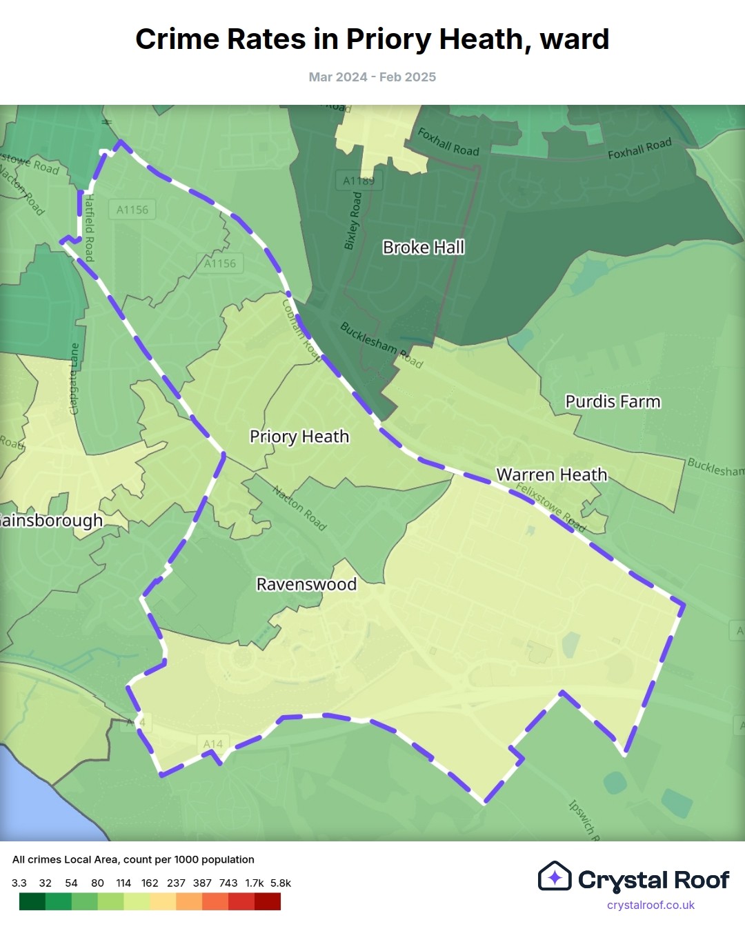 Priory Heath (ward) is located within Ipswich (borough). Annual total crime rate in Ipswich (borough) is 96.1 crimes per thousand resident population, which can be rated as 4 out of 10 or low crime level compared to other local authority districts in England and Wales.