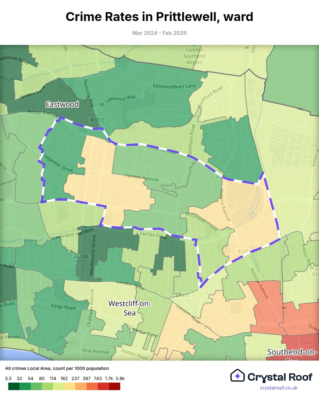 Prittlewell (ward) is located within Southend-on-Sea (borough). Annual total crime rate in Southend-on-Sea (borough) is 109 crimes per thousand resident population, which can be rated as 5 out of 10 or medium crime level compared to other local authority districts in England and Wales.