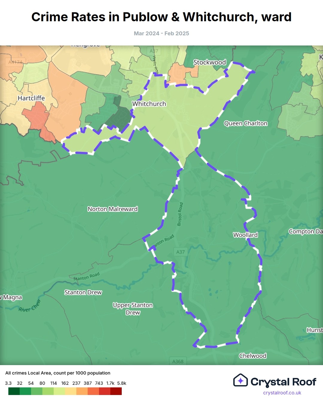 Publow & Whitchurch, (ward) includes areas with the following crime ratings (see map):