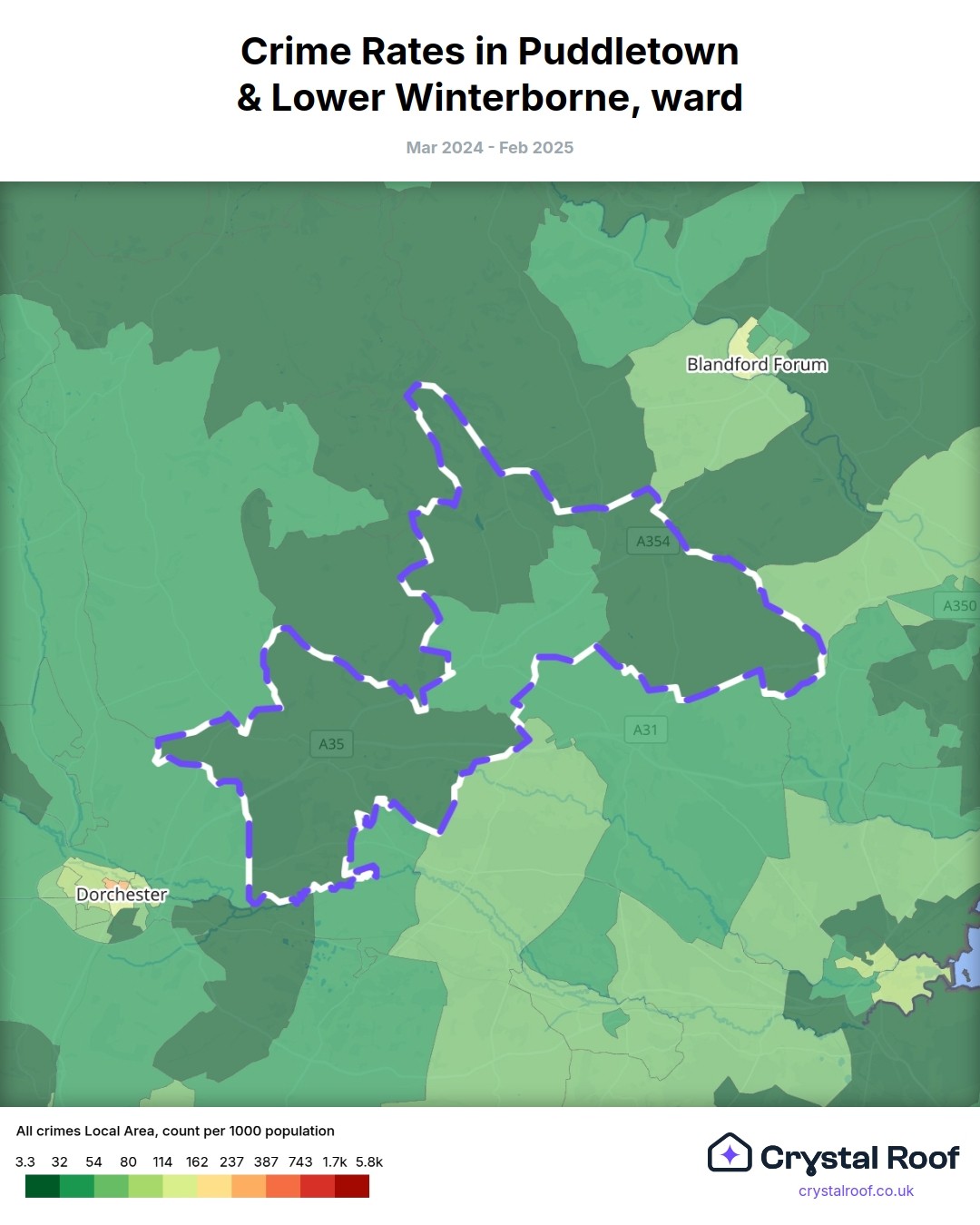 Puddletown & Lower Winterborne, (ward) includes areas with the following crime ratings (see map):