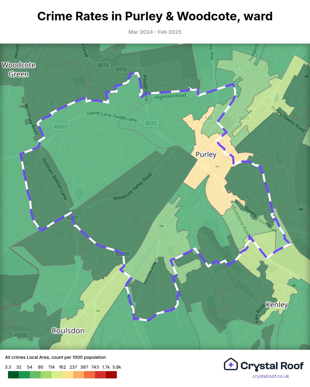 Purley & Woodcote, (ward) includes areas with the following crime ratings (see map):