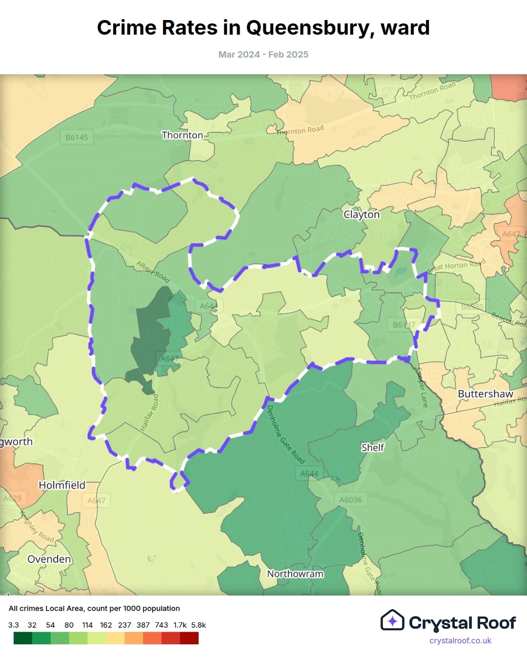 Queensbury, (ward) includes areas with the following crime ratings (see map):