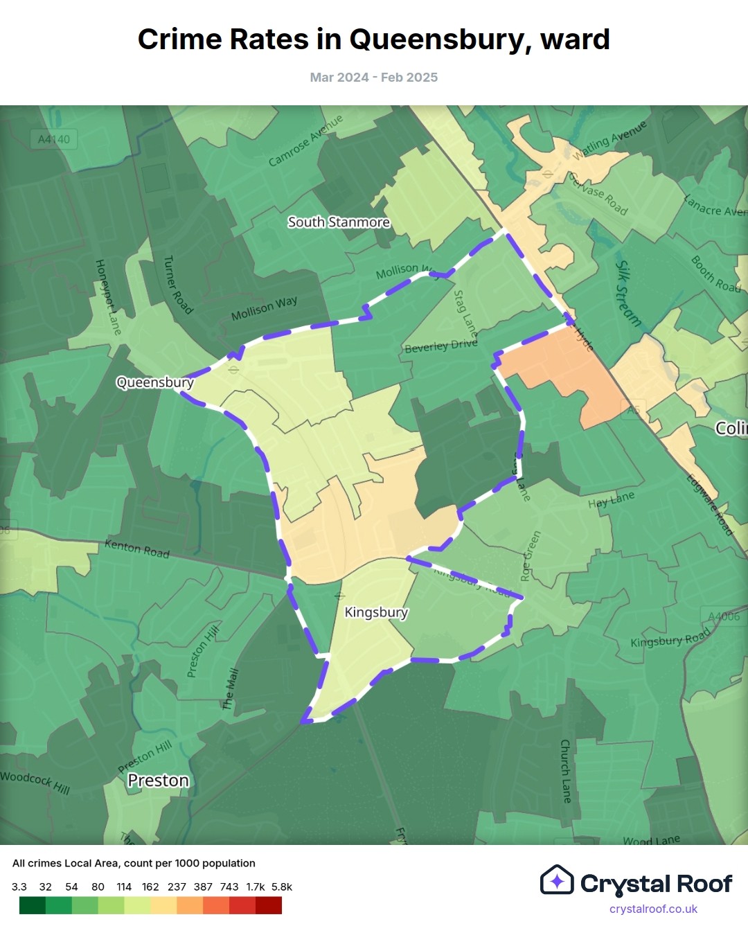 Queensbury (ward) is located within Brent (borough). Annual total crime rate in Brent (borough) is 126 crimes per thousand resident population, which can be rated as 6 out of 10 or medium crime level compared to other local authority districts in England and Wales.