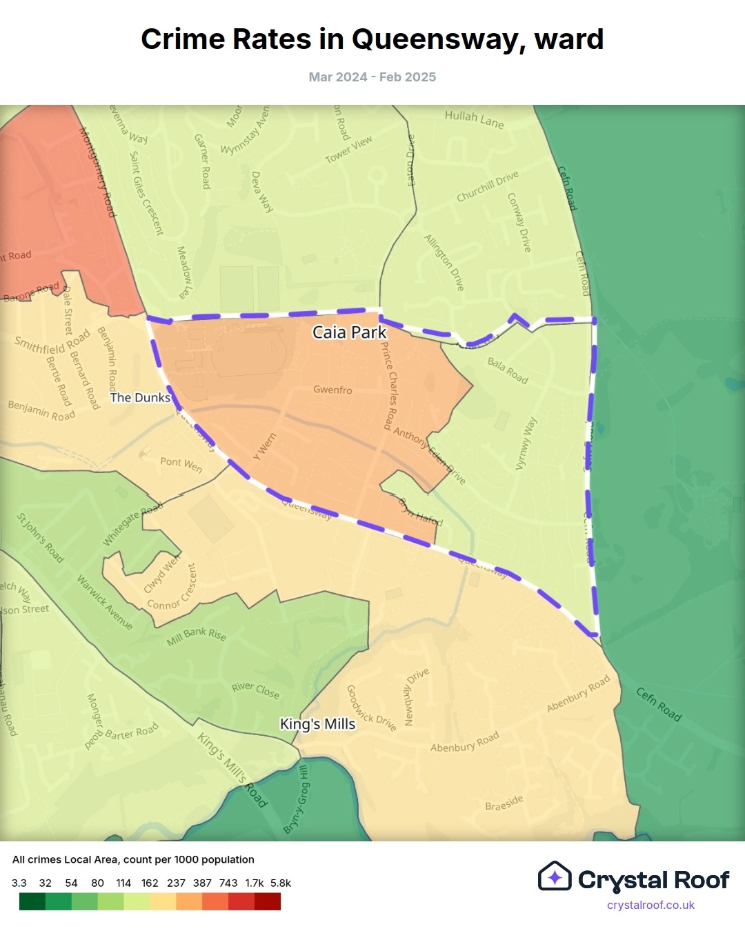 Queensway, (ward) includes areas with the following crime ratings (see map):