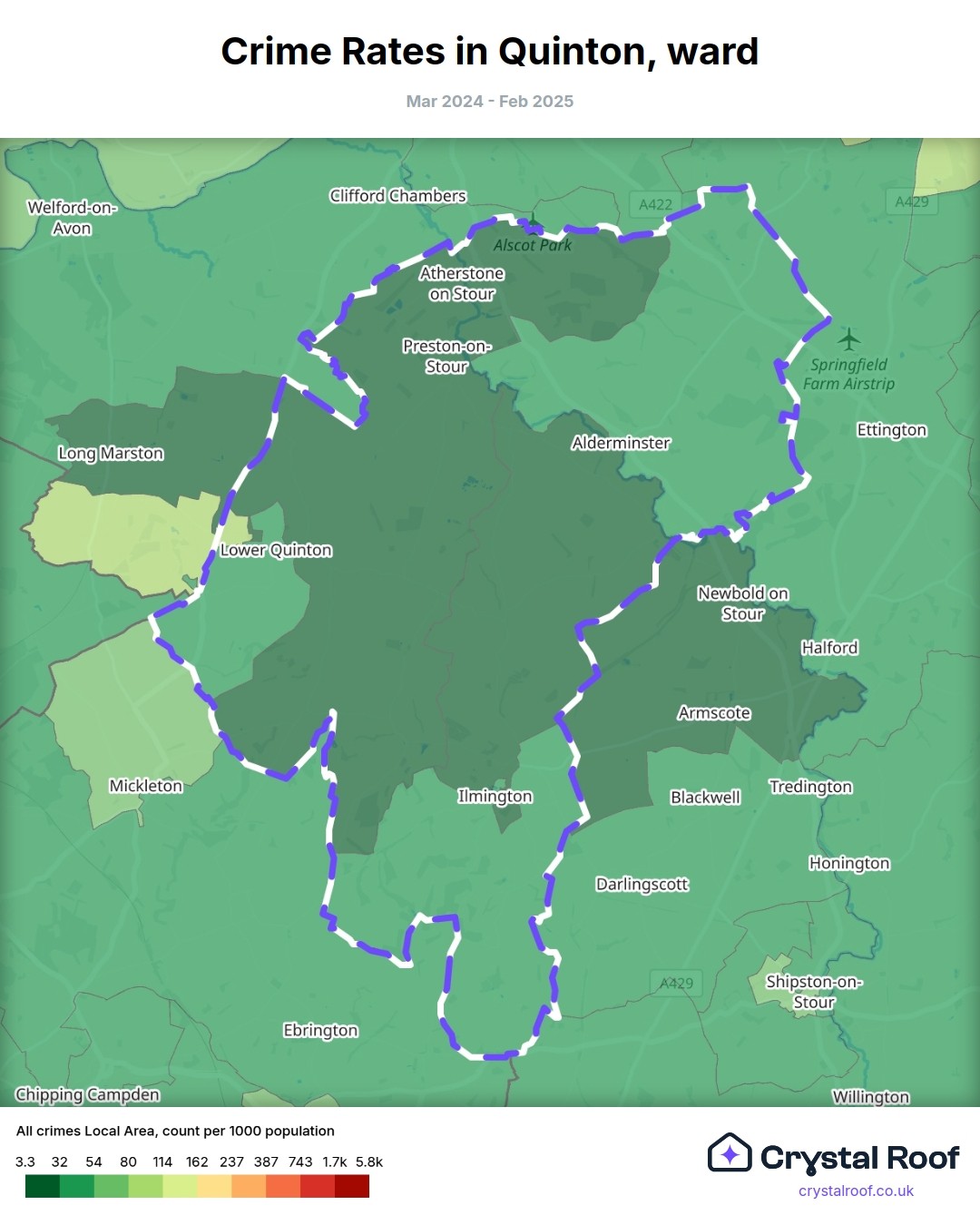Quinton (ward) is located within Stratford-on-Avon (borough). Annual total crime rate in Stratford-on-Avon (borough) is 69.8 crimes per thousand resident population, which can be rated as 2 out of 10 or low crime level compared to other local authority districts in England and Wales.