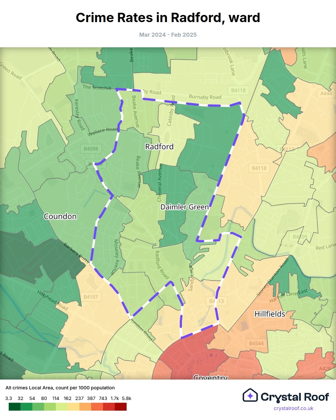 Radford (ward) is located within Coventry (borough). Annual total crime rate in Coventry (borough) is 108 crimes per thousand resident population, which can be rated as 5 out of 10 or medium crime level compared to other local authority districts in England and Wales.