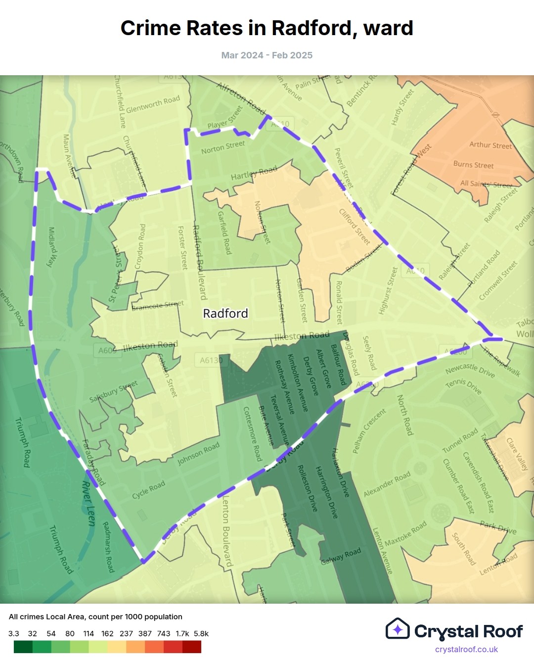 Radford, (ward) includes areas with the following crime ratings (see map):