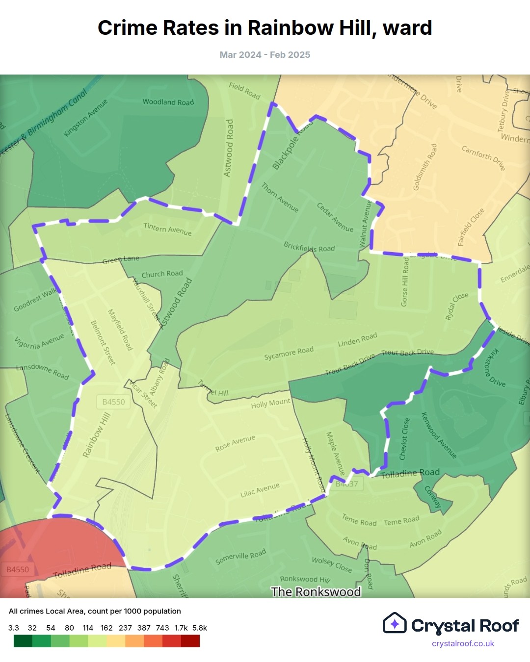 Rainbow Hill, (ward) includes areas with the following crime ratings (see map):