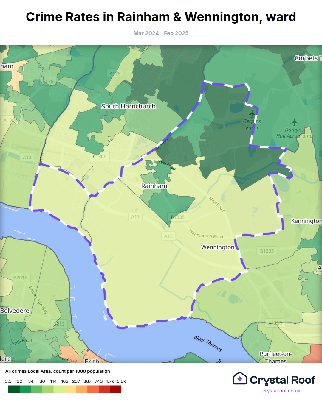 Rainham & Wennington, (ward) includes areas with the following crime ratings (see map):