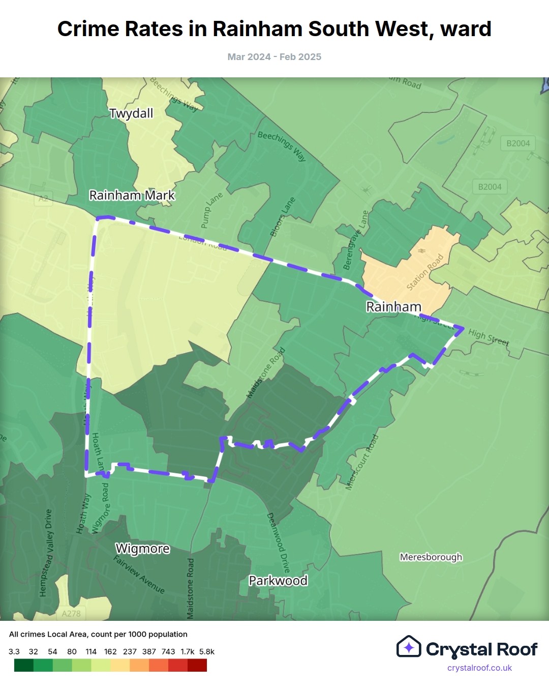 Rainham South West, (ward) includes areas with the following crime ratings (see map):