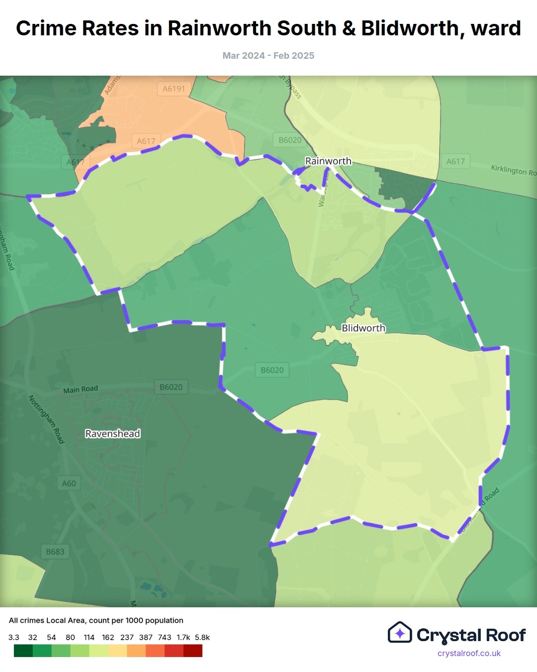Rainworth South & Blidworth, (ward) includes areas with the following crime ratings (see map):
