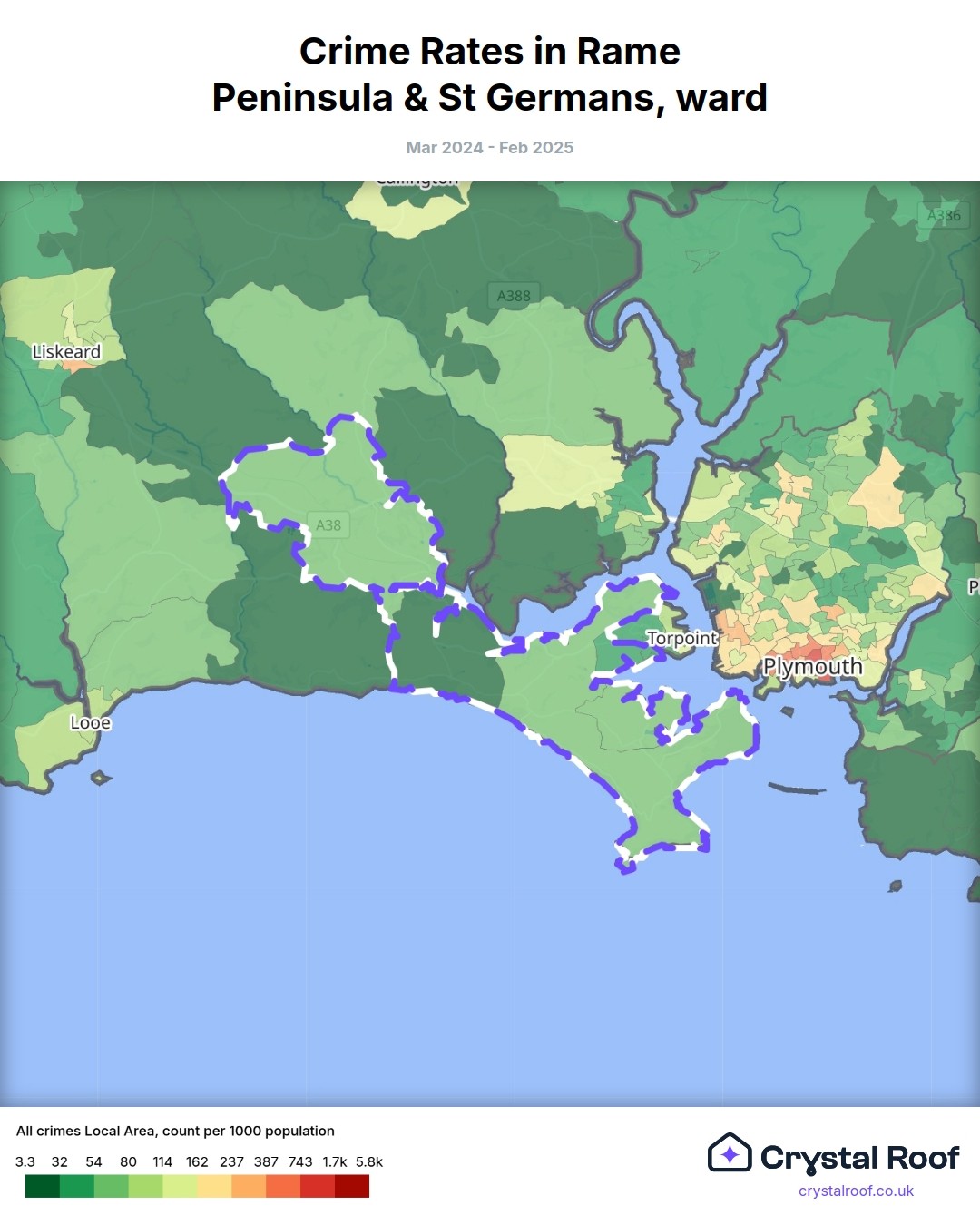 Rame Peninsula & St Germans, (ward) includes areas with the following crime ratings (see map):
