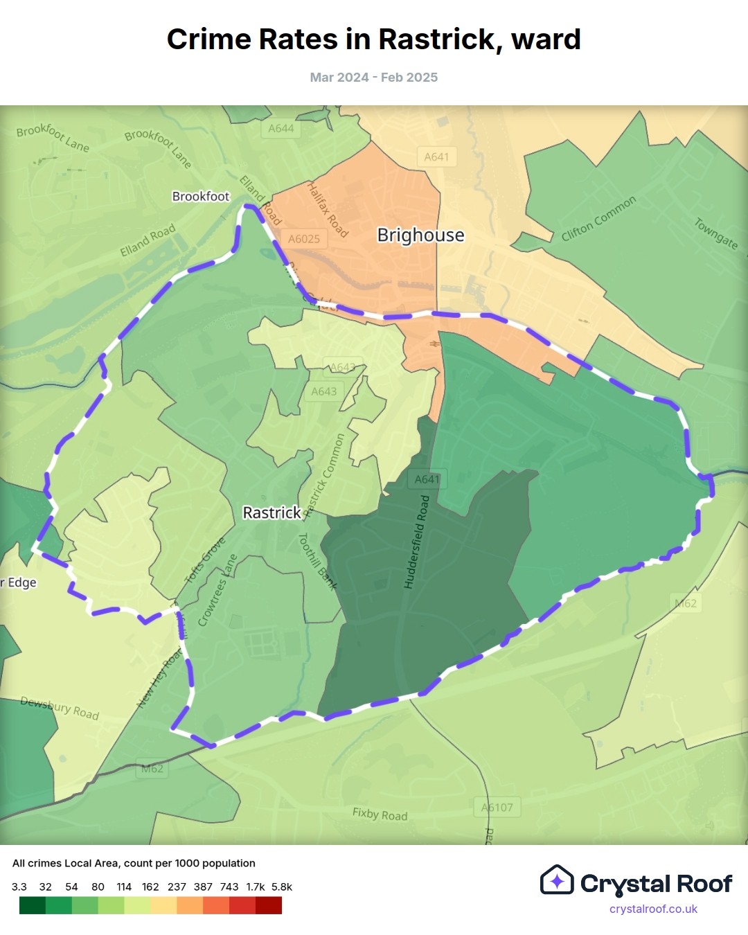 Rastrick, (ward) includes areas with the following crime ratings (see map):