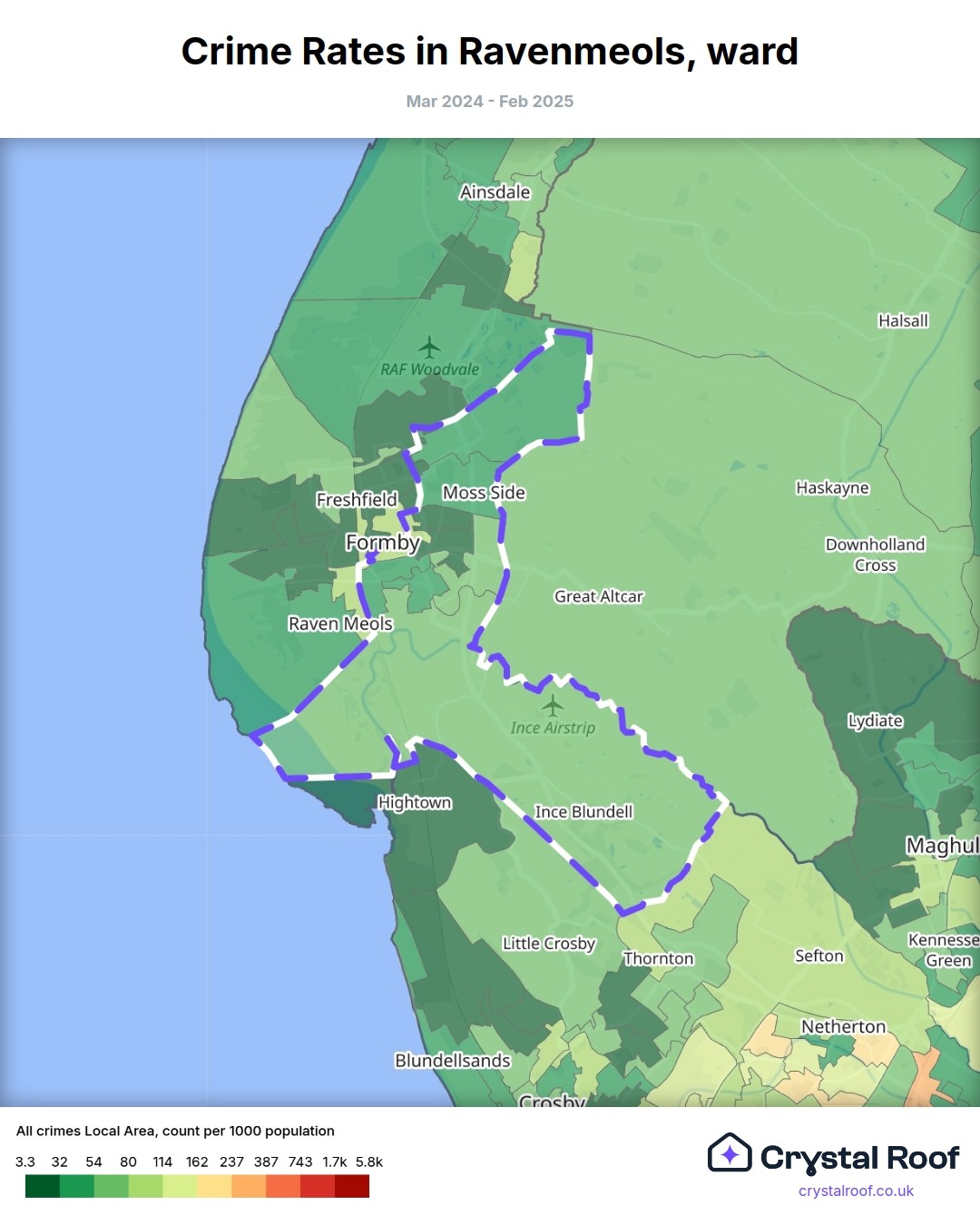 Ravenmeols, (ward) includes areas with the following crime ratings (see map):