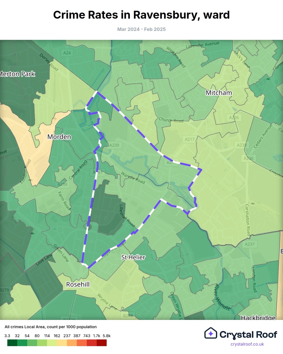 Ravensbury, (ward) includes areas with the following crime ratings (see map):