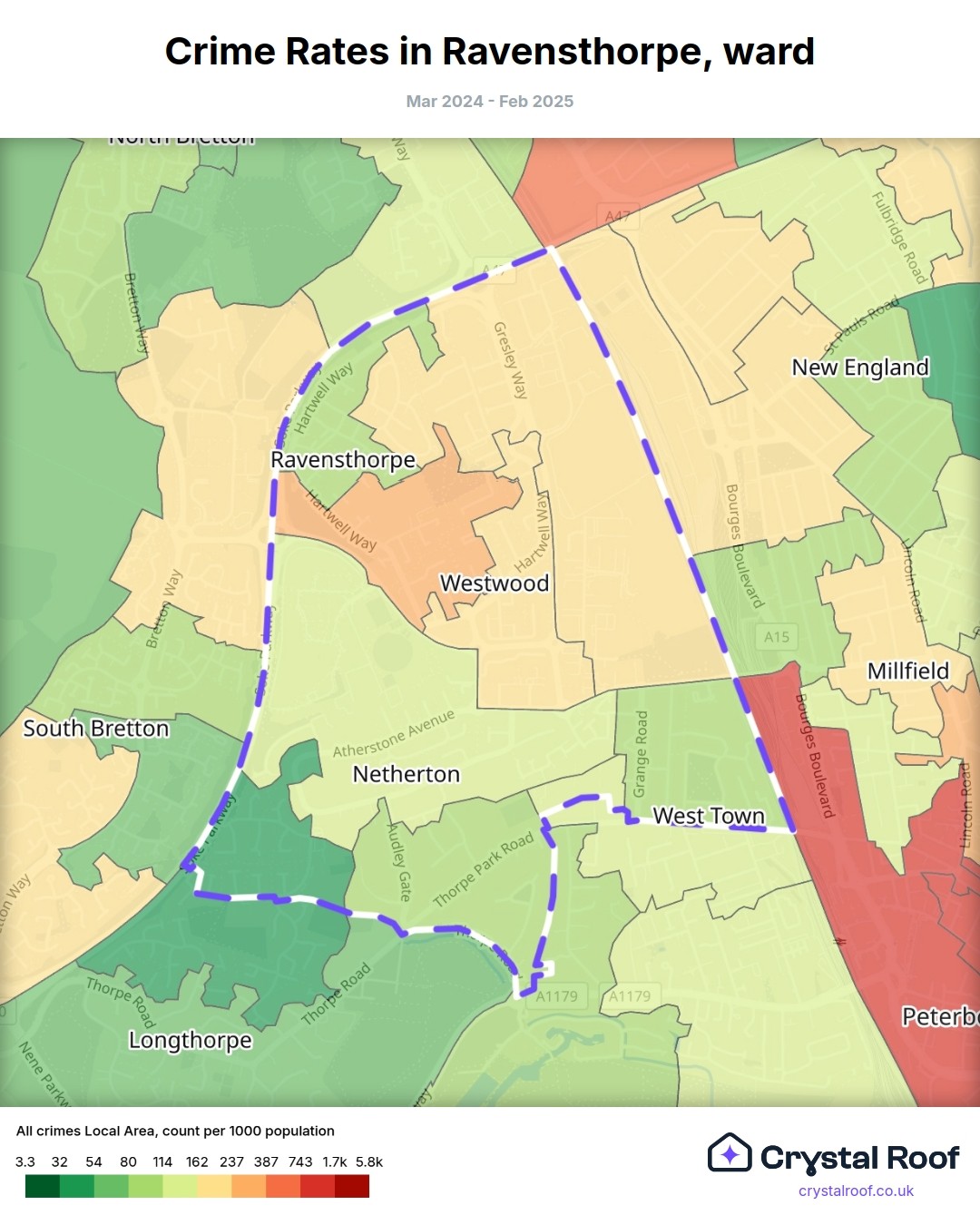 Ravensthorpe (ward) is located within Peterborough (borough). Annual total crime rate in Peterborough (borough) is 129 crimes per thousand resident population, which can be rated as 6 out of 10 or medium crime level compared to other local authority districts in England and Wales.
