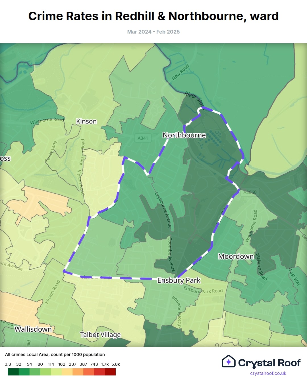 Redhill & Northbourne, (ward) includes areas with the following crime ratings (see map):