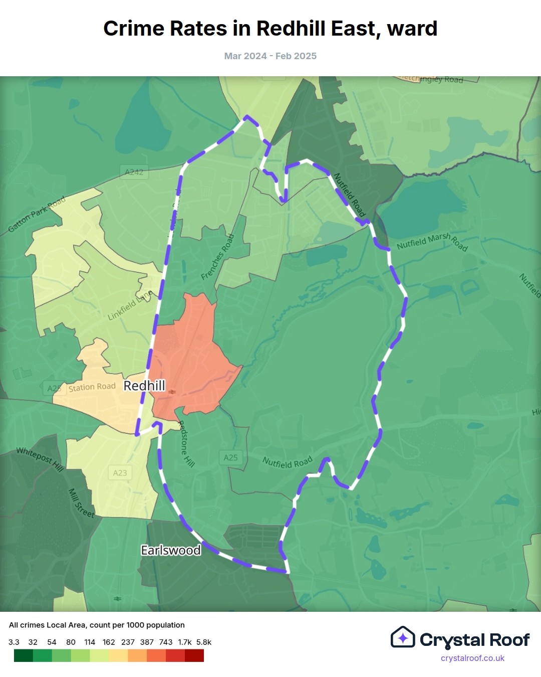 Redhill East, (ward) includes areas with the following crime ratings (see map):