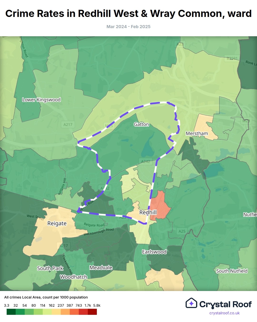 The figures in grey indicate the relative ratings of Redhill West & Wray Common (ward) for a specific crime type compared to other wards in England and Wales.