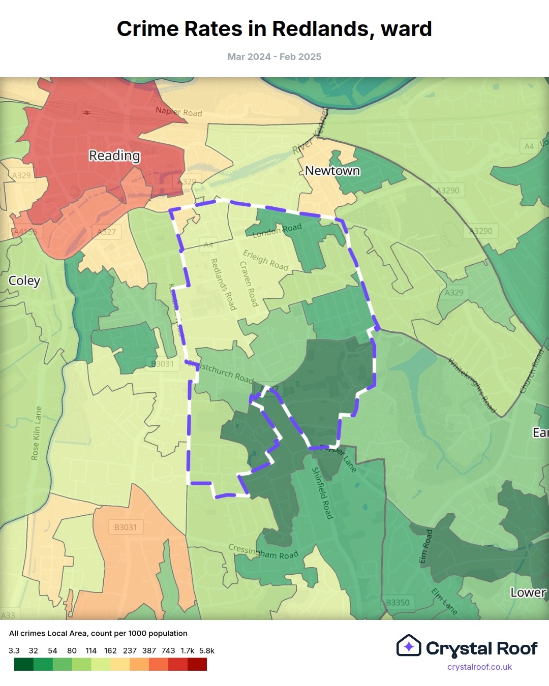 Redlands (ward) is located within Reading (borough). Annual total crime rate in Reading (borough) is 112 crimes per thousand resident population, which can be rated as 5 out of 10 or medium crime level compared to other local authority districts in England and Wales.