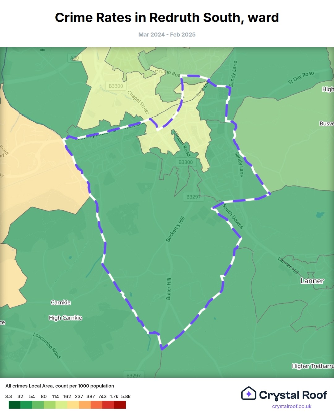 Redruth South, (ward) includes areas with the following crime ratings (see map):