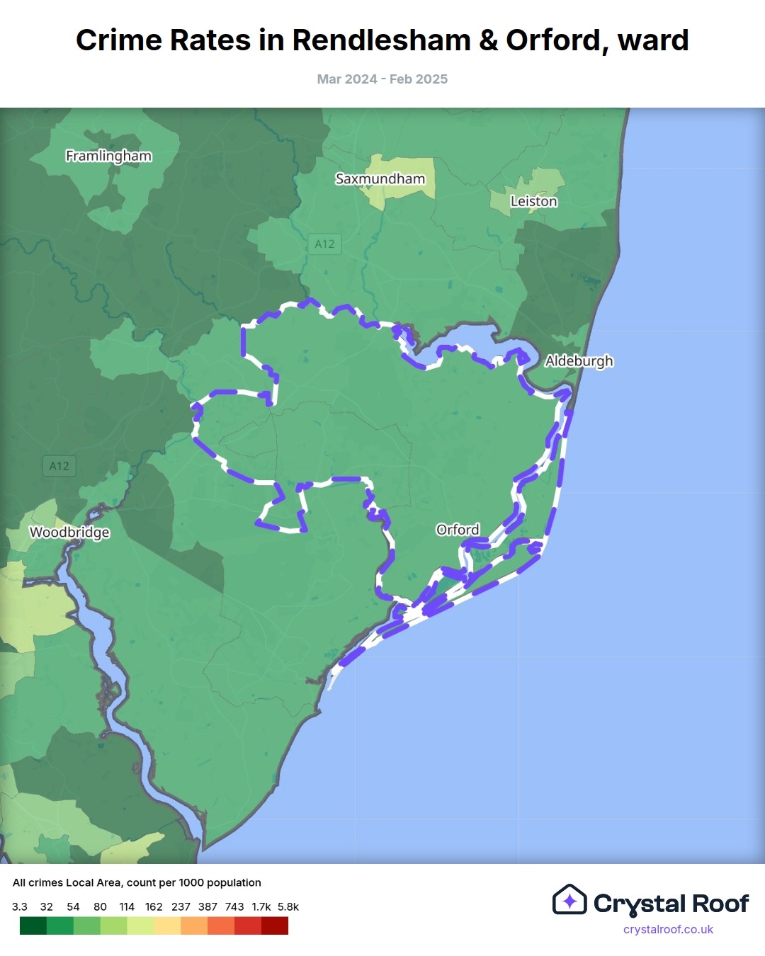 Rendlesham & Orford, (ward) includes areas with the following crime ratings (see map):