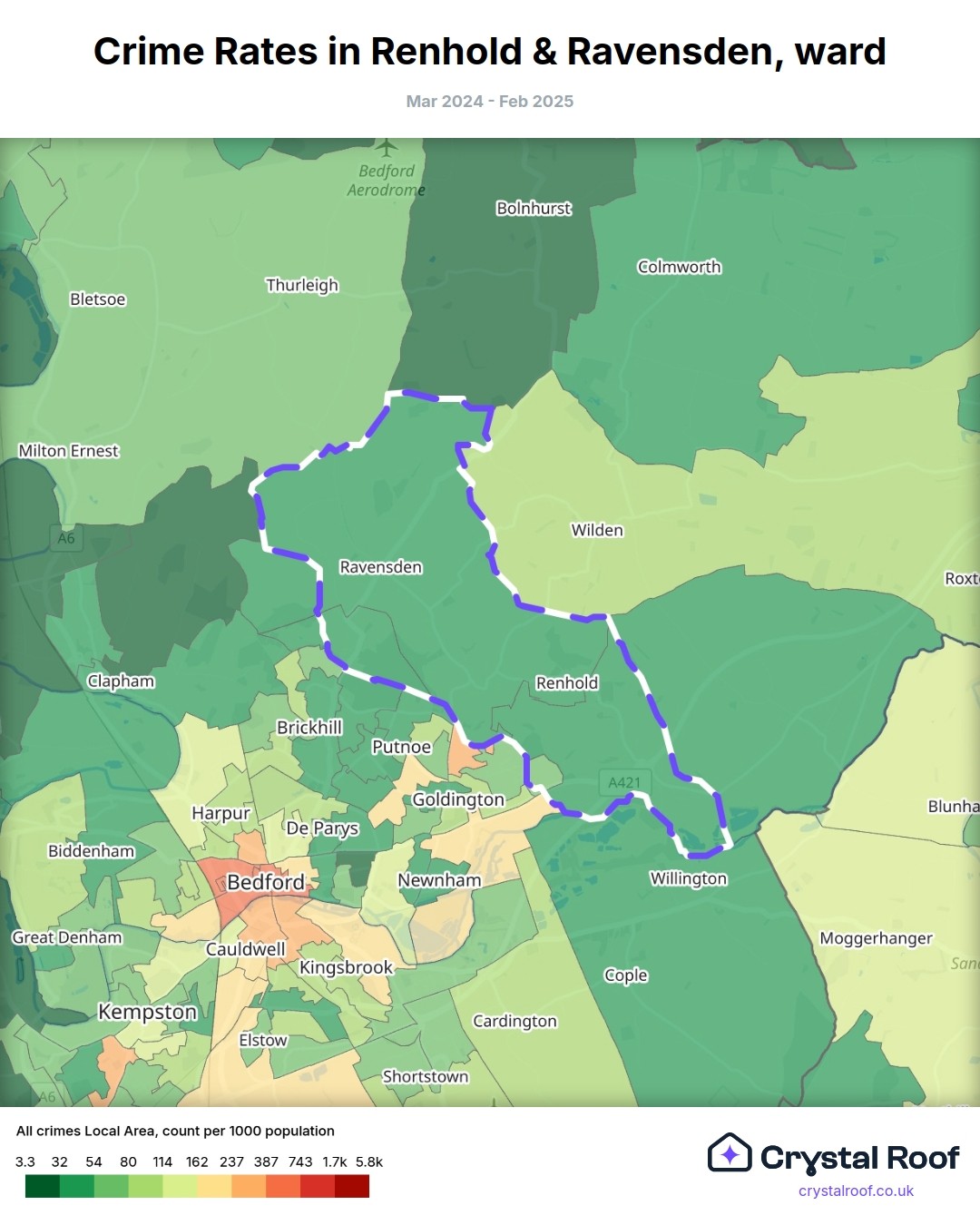 The figures in grey indicate the relative ratings of Renhold & Ravensden (ward) for a specific crime type compared to other wards in England and Wales.